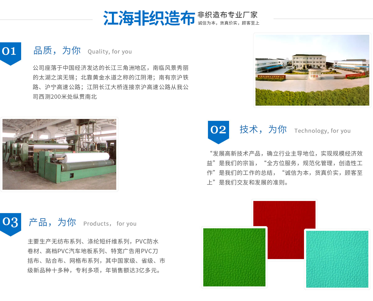 江海企業(yè)有江陰市江海非織造有限公司、江陰市江海防水材料有限公司、江陰市三江寬幅無紡布有限公司、江陰市三江織物涂層新材料有限公司組成,均屬于江蘇省民營科技企業(yè)。企業(yè)現(xiàn)擁有員工近千名,占地15萬平方米,廠房建筑面積達(dá)80000多平方米,凈資產(chǎn)超億元,主要生產(chǎn)無紡布系列、滌綸短纖維系列、PVC防水卷材、高檔PVC汽車地板系列、特寬廣告用PVC刀括布、貼合布、網(wǎng)格布系列,其中國家級、省級、市級新產(chǎn)品十多種,專利多項(xiàng),年銷售額達(dá)3億多元。